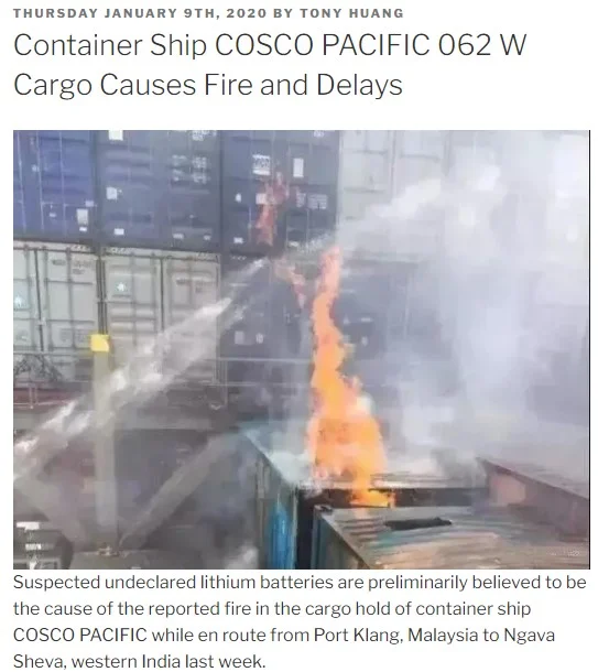 こちらは、海上輸送になりますが、2020年1月に発生した無申告のリチウム電池輸送によるコンテナ火災のニュースです。