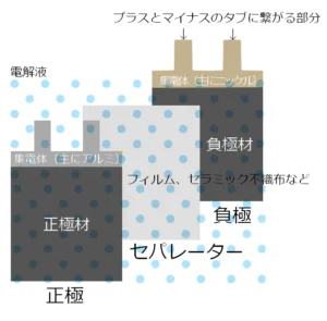 電解液は液状で、セパレータおよび電極活物質に含侵(がんしん)しており、リチウムイオン電池が充電または放電されると、電解液の中をリチウムイオンが遊動(ゆうどう、自由に移動)し正極と負極の間を移動します。