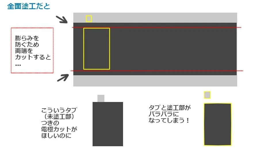 それを避けるため、両端を切り落とすと、今度は電極タブ(+/-ケーブルに外部接続する金属部分、または、タブの溶接に必要な金属部分)が確保できなくなります。
