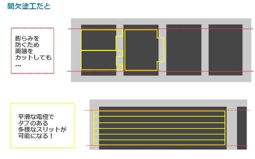リチウムイオン電池の電極製造で行われる「間欠塗工」は、未塗工部分を挟む塗工方法です。